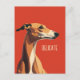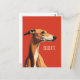 This is a minimalist postcard design featuring a brown greyhound illustration against vivid red background and a customisable text "delicate".