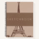 This sketchbook features a brown front cover with an illustration of the Eiffel Tower in Paris, France.