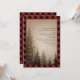 A rustic wedding invitation featuring an illustration at bottom of evergreen trees over a brown background. Border and reverse side are red and black buffalo plaid.