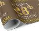This wrapping paper design features a message like "HAPPY 28th BIRTHDAY", with the "28th" having a faux/imitation gold appearance. It also features a customisable name, and a brown coloured background. It could perhaps be used when wrapping gifts being given for somebody’s twenty eighth birthday. [~Z0000133]