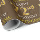 This wrapping paper design features a message like "HAPPY 72nd BIRTHDAY", with the "72nd" having a faux/imitation gold appearance. It also features a name that can be personalised, and a brown coloured background. It could perhaps be used when wrapping gifts being given for somebody’s seventy second birthday. [~Z0000133]