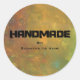 A sticker for handmade products, customise with your name or business.An acrylic painted print using a variety of earthy toned colours including rich browns, natural greens, gold, yellow and red. Has a rugged rustic grunge styled well worn look.