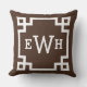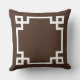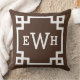 Stylish and modern square accent pillow design features a Greek key geometric border frame design and monogram that can be personalised. Dark espresso brown and white colours. Background colour can be modified.