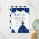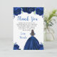 This birthday party thank you card features faux glitter navy blue floral flowers and a beautiful princess with brown hair and an elegant dress. This is perfect for a birthday party.