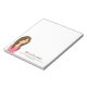 Are you looking for a personalizable hair salon / beauty salon notepad? This notepad features Destei's cartoon illustration of a beautiful woman who has voluminous long brown hair. The woman is wearing a pink shirt and her lips are also pink. Next to the image there are personalizable text areas for business name and contact information.