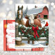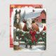 Personalised Christmas postcard. Pretty watercolor style ai illustration of a brown horse, spotted cow on a farm on a snowy winter day with a cardinal on the rustic fence and a red barn in the background.
