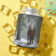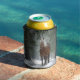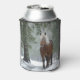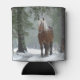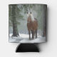 Can cooler with a photograph of a brown horse with a long white scruffy mane. Standing in a forest with snowflakes falling all around.