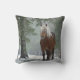 A pillow with a photograph of a brown horse with a long white scruffy mane. Standing in a forest with snowflakes falling all around.