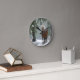 A clock with a photograph of a brown horse with a long white scruffy mane. Standing in a forest with snowflakes falling all around.