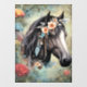 A horse's head with a lush mane. A beautiful brown horse among flowers.