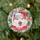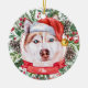 This sophisticated ceramic Christmas ornament features a watercolor of a beautiful Husky with brown and white fur in a Santa hat, surrounded by holiday greenery, pinecones and berries, with a red banner with your pet's name (or change to Merry Christmas). You can fully personalise this design by changing the greeting and year on the back in an elegant font. This is a stylish, yet inexpensive, custom Christmas ornament, and it's perfect for Husky lovers, dog lovers, or pet lovers.