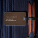 Brown faux leather print as background. Personalise and add your monogram letters and full name on the front. Your contact information on the back.