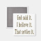 Brown letters read, "God said it. I believe it. That settles it." Terrific way to share your faith in God and your belief in your religion. Wonderful gift for Christmas, Easter, birthdays or any special time. Terrific, also for religious occasions such as ordinations, weddings, baptisms, first communions, confirmations, and any holy day.