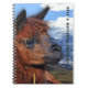 Personalize this llama face notebook for anyone. A beautiful chocolate brown llama is featured, with a mountain range background. Customize with text down the side, with a name and title of the journal. The sample wording is for knitting notes as llama hair is a specialty fiber for knitters and fiber artists.