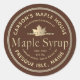 An earthy-coloured maple syrup label with the words "Maple Syrup" in an embossed metallic gold font. Triple line border in gold. GOLD maple leaf and text.
