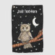 This golf towel is black with white stars and a brown owl sitting on a tree branch wearing a blue necklace with golden yellow yes with a white crescent moon in the sky. Customise your text with the template.