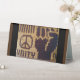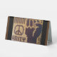 Image printed on table tent is from a photo of an original tapestry crochet creation designed handmade and Copyright © by published designer Delores Chamblin. The picture of the front section of the unique brown earth tone handcrafted bag with peace sign, solidarity fist and unity is reproduced on the stand alone tent.