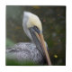 A brown pelican head view against a brown green background with the bird facing right, by Susan L. Marsh