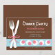 Elegant and sweet dinner party invitations with a white fork & knife on a pink, blue, and brown themed design.
