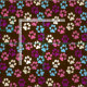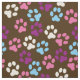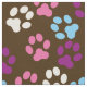A printed fabric design featuring pretty pink, blue and plum dog paw prints on a brown background.