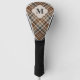 This golf driver cover features your monogram in dark grey within an ornate banner framed in brown and black. The banner is placed in the centre of an attractive brown, grey, tan and white plaid pattern background. Classy for him, and makes a great gift for the golfer.