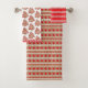 Here's a unique Holiday Season three piece towel set that is festive and pretty. The individual pieces feature Christmas gingerbread patterns in brown, red, and white. The bath towel has a zigzag chevron and red button pattern on a brown background. The hand towel has Holiday tree cookie images, with a white zigzag border on red at each end. And the washcloth repeats the red and white zigzag pattern across the entire surface. Completely coordinated and fun for the Holiday Season.