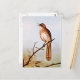 A cute little brown thrasher sings in this illustration by Ernest Seton Thompson. This speckled brown and white bird perches on a branch against a pale grey blue sky with his beak wide open.