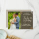This wedding couple photo thank you flat card features a beautiful wedding photo of the bride and groom. They are both dressed in their wedding attire and smiling as they look at each other. The inside of the card is blank and can be customised with a personalised message. Easy template lets your add your photo and details to this card.