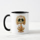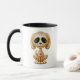 This adorable brown puppy design is decorated with swirls and dot patterns. Yellow flower pedals circle the pure black eyes in the tradition of the Day of the Dead sugar skulls. The little dog is sitting down, looking forward with its tail waving in the background. The oversized head sits on a tiny body which creates a playful, cartoon like appearance. A five point star sits in the middle of the puppy’s forehead while a bright red and yellow heart appears in the centre of the chest. This cute little puppy is a fun and stylish design inspired by the beautiful patterns of Day of the Dead sugar skulls.
