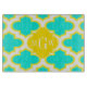 Bright Aqua, Yellow and White Moroccan Quatrefoil Lattice Pattern, Pineapple Yellow Quatrefoil 3 Initial Monogram Label