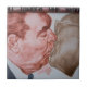 a photo from The East Side Gallery in Berlin, the former Berlin Wall, showing the mural titled the Bruderkuss - brotherly kiss is featured on this beautiful tile for use around the home.