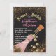 Chic champagne and glitter birthday brunch party invites- Reads 'Brunch & Bubbly' at the top in modern, gold colour lettering with an elegant, pink ampersand. Personalised with guest of honour's name and event in matching pink lettering style. Faux gold glitter borders the top and bottom against a matte charcoal black background. Bottom has pink and faux gold foil, vintage champagne bottle popping its cork with faux foil, gold champagne bubbles. The personalised birthday brunch information, including RSVP details, is printed in white letters below on the left. Back has black background, which may be changed to any colour you prefer. Elegant adult brunch birthday party invitations ready to be personalised with your own details. We have coordinating, champagne brunch paper napkins and other brunch invitations in our Zazzle.com/angela65* shop.