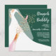 Brunch and bubbly bridal shower invitations feature a bride in her gown and veil on an emerald green background with bottle of sparkling wine, glass flute and faux sequins with your details in chic white lettering. **TIP: Square size REQUIRES EXTRA POSTAGE. MORE colours in our collection.