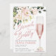 Bridal Shower invitation features rose gold pink flowers, champagne glass and shiny lettering. This design is ideal for someone having a bridal brunch shower.