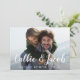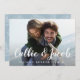 An elegant wedding save the date postcard designed to accommodate your favourite horizontal or landscape orientated full-bleed engagement photo. Your names appear as a white text overlay in modern hand lettered brush calligraphy script. Personalise with your wedding date and wedding location beneath. Cards reverse to a subtle botanical pattern in soft blue with space to include your wedding website url or any additional information you choose. You can change the back colour by clicking Customise/Personalise and then selecting new background colour either from the palette or by entering a colour hex code.
