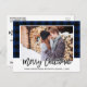 Modern Brush Script Blue Plaid Couple Photo Christmas Postcard