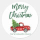 Brush Script Watercolor Red Vintage Truck with Christmas Tree - Merry Christmas Family Name Envelope Seal - Green