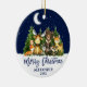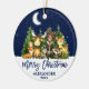 Modern Brush Script Merry Christmas Watercolor Woodland Animals Forest Animals Pine Trees Moon, Starry Sky and Snow Ornament . Baby Animals include Bear, Deer, Moose, Racoon, Bunny Rabbit, Fox and Owl with forest greenery. Blue Text. Add Name.