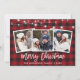 Rustic Wood Brush Script 3 Photo Family Merry Christmas Card with String Lights - Red Buffalo Plaid