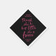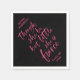 Stylish graduation napkin featuring pink brush script of the quote "though she be but little she is fierce" from A Midsummer Night's Dream by William Shakespeare against a black background.