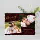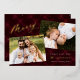 Elegant holiday photo card featuring "Merry" in a gold foil calligraphy script on a painted burgundy plaid background. Personalise the front by adding two of your favourite photos, a greeting, name, and year. The rustic gold foil Christmas card reverses to display an additional photo with a snowy burgundy plaid background.