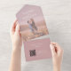 A modern photo wedding invitation with a coloured photo filter and traditional elegant typography.