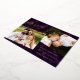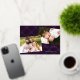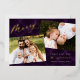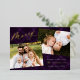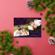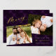 Elegant holiday photo card featuring "Merry" in a gold foil calligraphy script on a painted purple plaid background. Personalise the front by adding two of your favourite photos, a greeting, name, and year. The rustic gold foil Christmas card reverses to display an additional photo with a snowy purple plaid background.