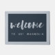 A great gift for newlyweds or new homeowners, our personalised welcome doormat in chic navy blue and grey features "welcome" in modern, brush script lettering. Personalise beneath with your house number, address, house name or family name.