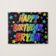 This fun, lively, birthday-themed jigsaw puzzle design has the message "HAPPY BIRTHDAY, BRYAN" with the characters having a colourful rainbow spectrum inspired gradient pattern, along with a vibrant star field background pattern. A colourful puzzle like this might be used to send a birthday greeting message to somebody named Bryan. [~Z0000468]
