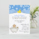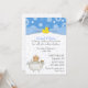 Cute baby boy shower invitation, done in blue and white, with polka dots and graphics of a big pale blue bow, with a rubber ducky decorating the middle. Adorable country artwork of a baby in a bath tub on the bottom left side. Personalise the text to suit your shower party needs.