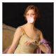 Pop art work of a remix vintage painting of a woman in yellow blowing a pink bubble gum.