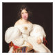 Vintage painting pop art of a woman in a white dress blowing a pink bubble gum