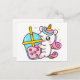 Kawaii rainbow unicorn hugging pink bubble tea.