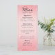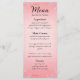 These bubblegum pink wedding menus feature a soft blush gradient background framed by a slim border and delicate white floral accents in each corner, creating a romantic touch at every place setting. The tall, slim layout with elegant script and clean serif fonts beautifully highlights each course, coordinating perfectly with the Bubblegum Blush stationery suite for a cohesive reception look
